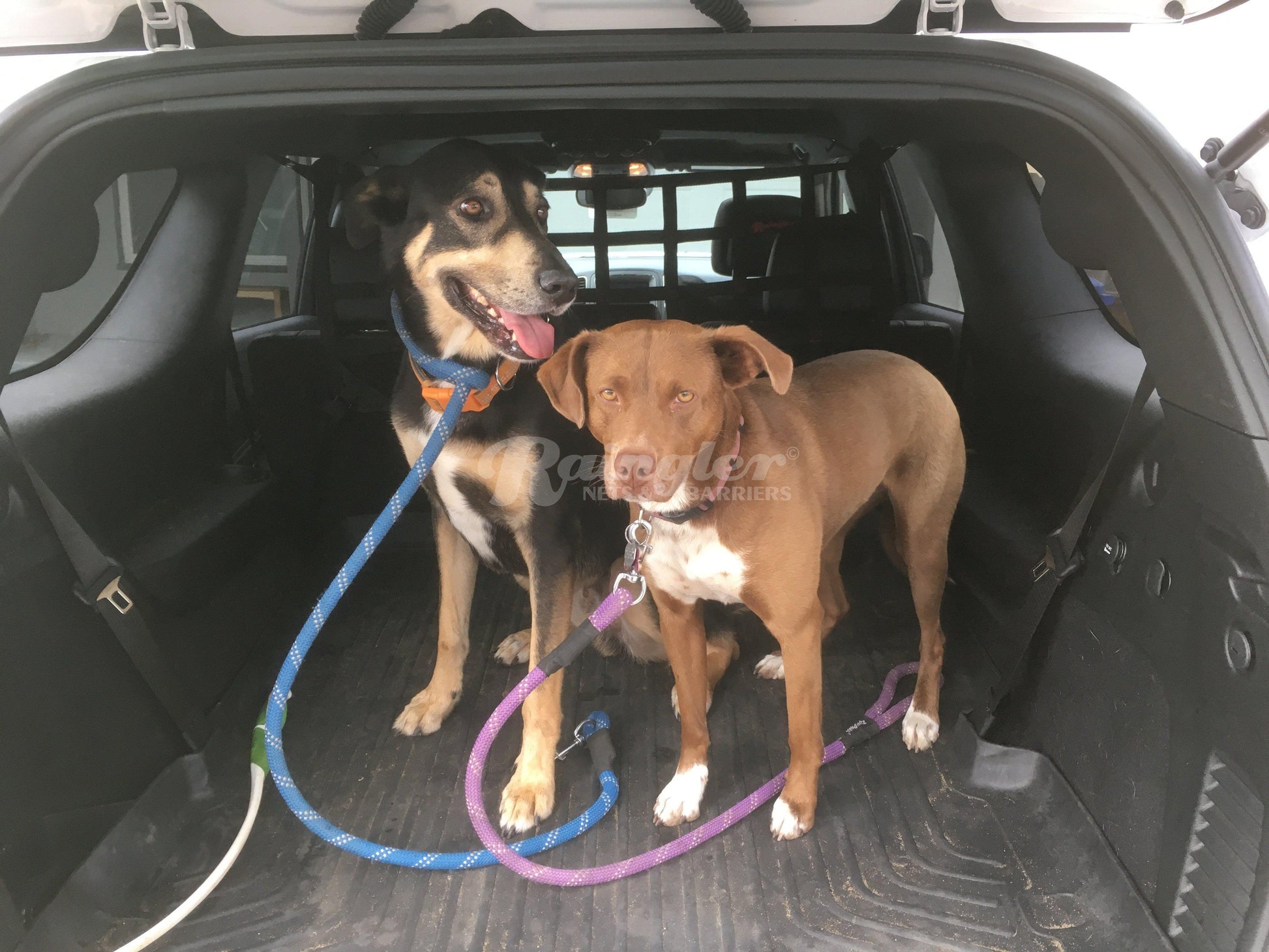 Behind 2nd row seats upper barrier divider net with quick release rings to keep gear and dogs securely in back.