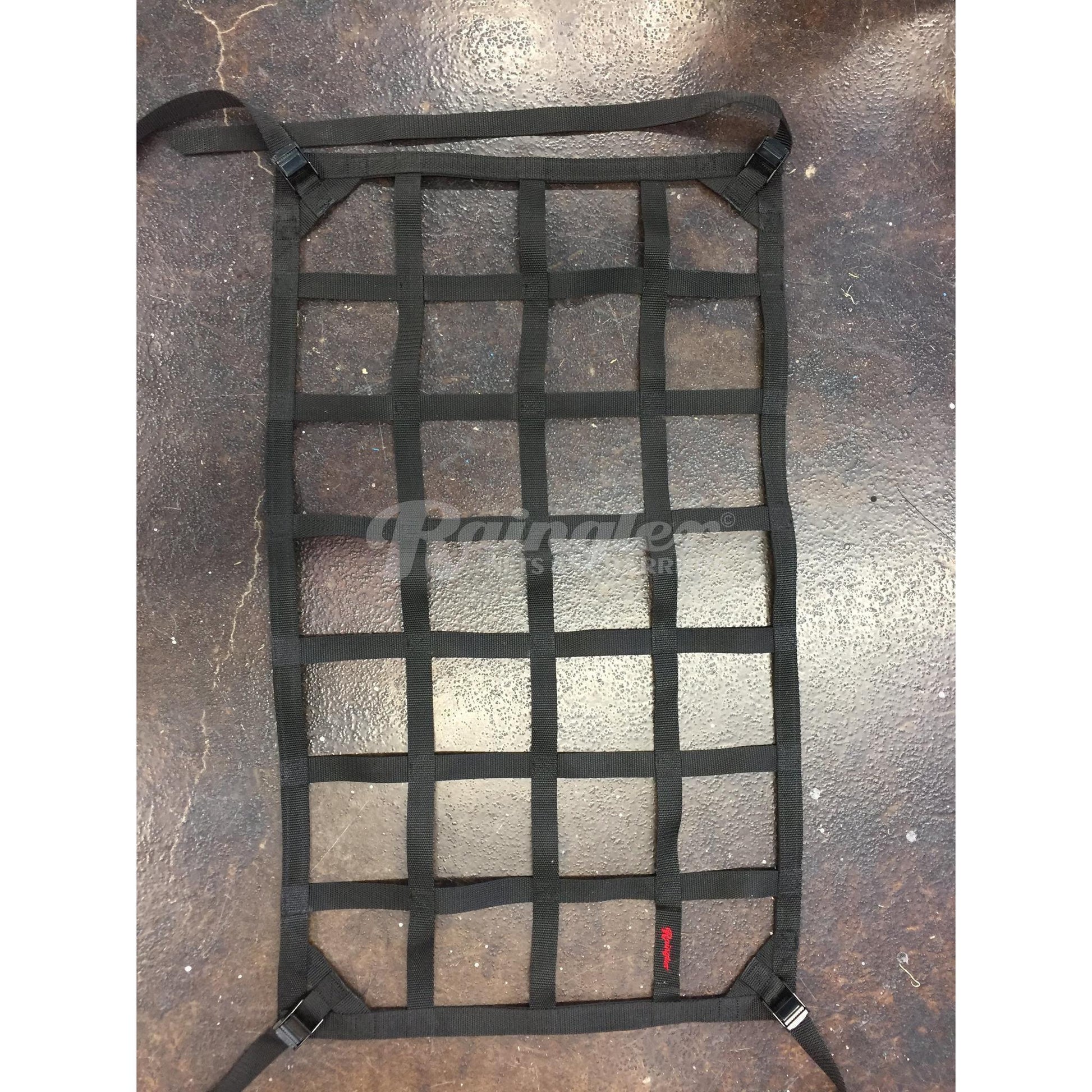 Webbing net versions come with 4" or smaller openings. Ceiling Nets made in standard cargo net webbing style will act as a storage area for hanging, affixing carabiners or stowing soft gear larger than the 4” openings. If you want maximum height to ceiling or carry smaller items we recommend our mesh or hybrid versions.