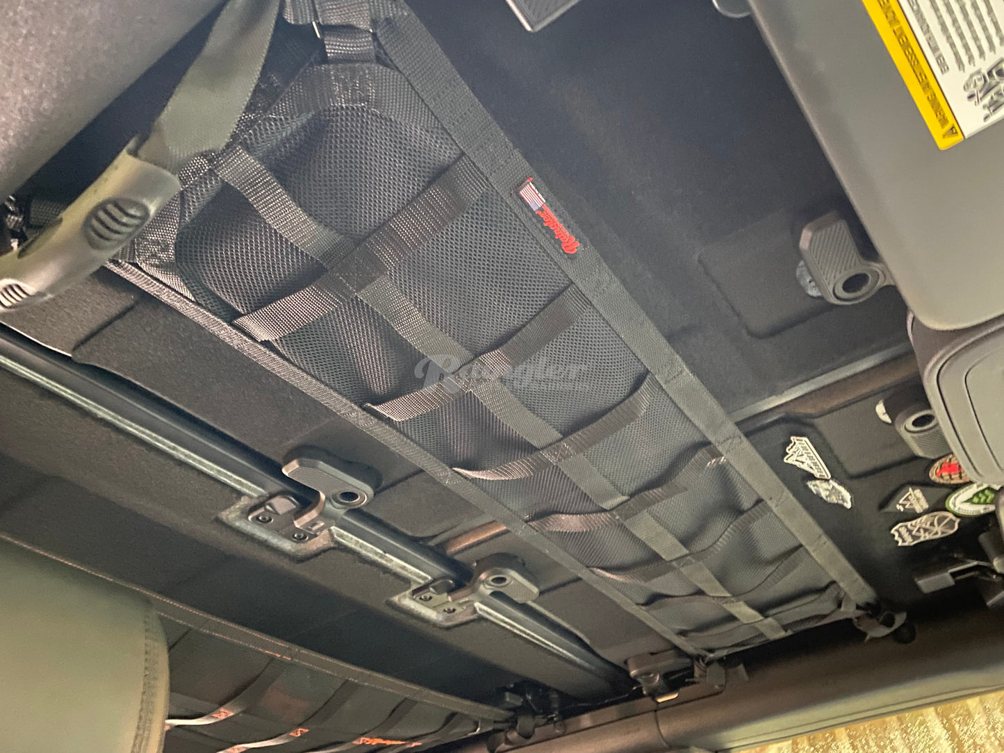 Ceiling attic net for the Ford Bronco for carrying soft goods such as jackets, blankets, camping equipment overhead.