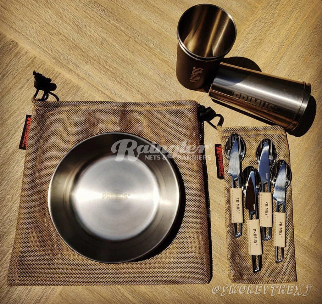 Sizes are approximate laid flat, in inches with high quality military grade mesh, 550 paracord drawstring in your selected color with nylon lock and sewn on Raingler logo.