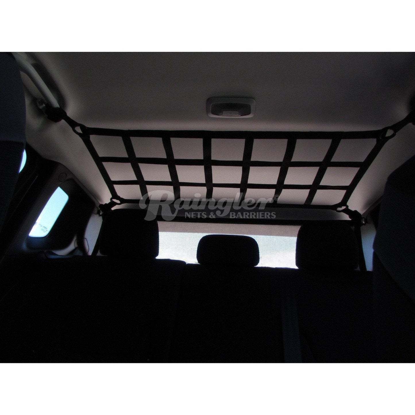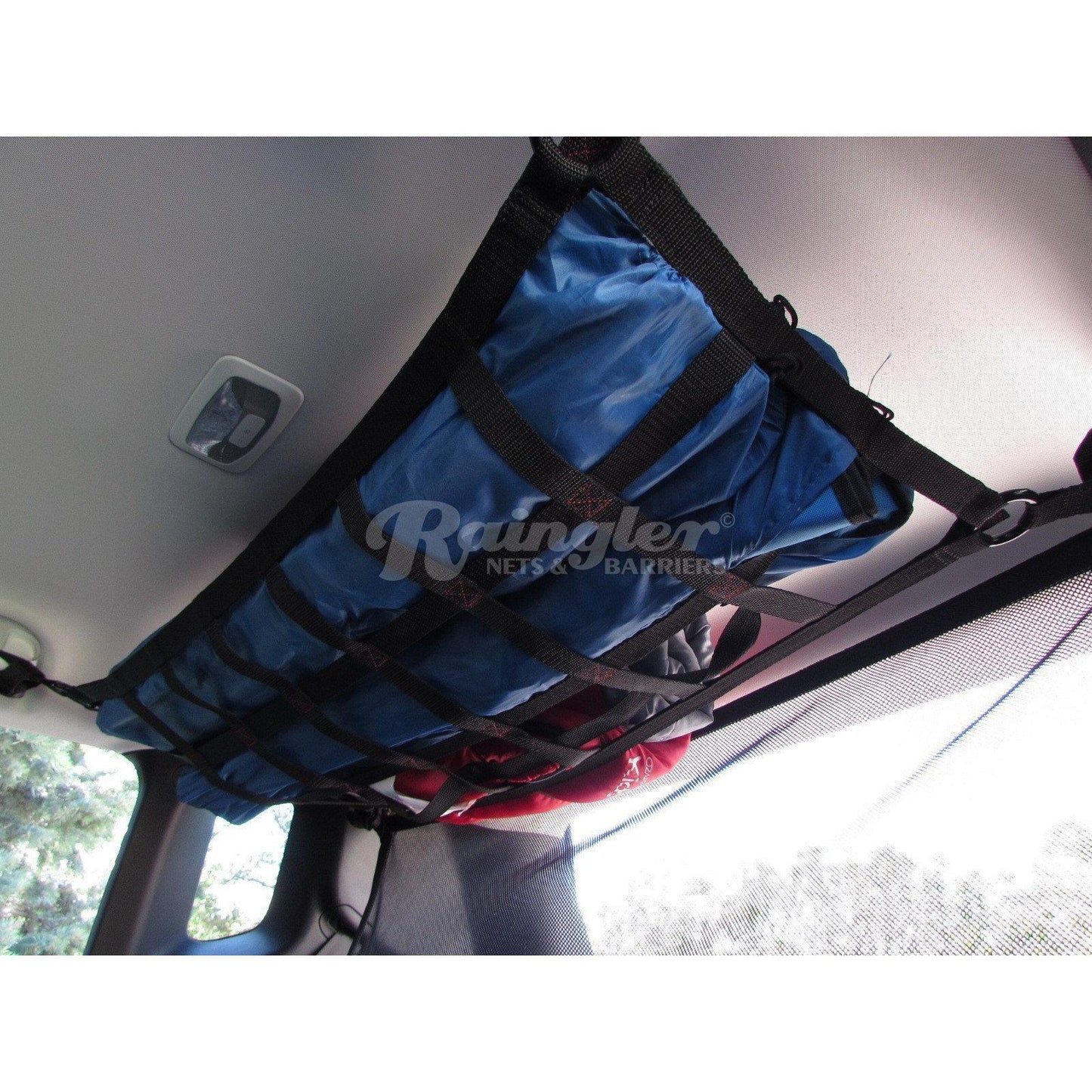 Adjustable rear cargo area ceiling net for jackets, first aid kits and lighter cargo.